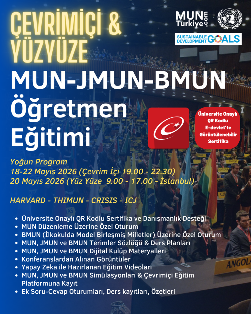 Eğitimin Amacı Model Birleşmiş Milletler (MUN) Öğretmen Eğitimi; öğrencilerini yurt içi ve yurt dışındaki MUN konferanslarına hazırlamak ya da kendi okulunda/kurumunda MUN konferansı düzenlemek isteyen yabancı dil öğretmenlerine yöneliktir. Bu eğitim MUN (Lise-Üniversite), JMUN (Ortaokul), BMUN (İlkokul) seviyeleri için uygundur. Kayıt Linki: https://forms.gle/RGMyVdA1UkJ4Se4ZA Eğitim Tarihi 18-22 Mayıs 2026 (Çevrim İçi) 20 Mayıs 2026 tarihinde İstanbul […] More
