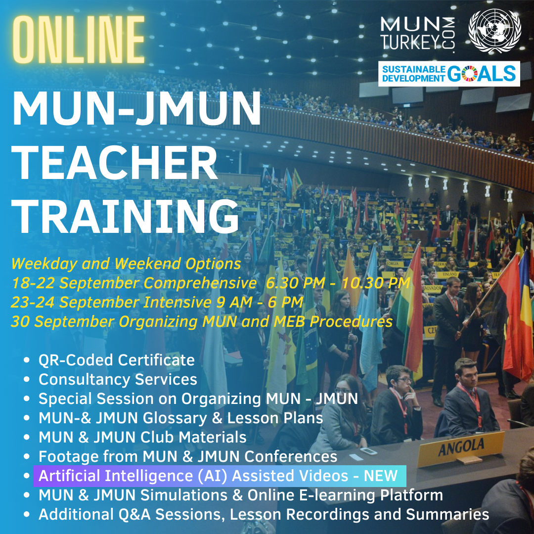 MUN-JMUN Teacher Training is aimed at foreign language teachers who want to prepare students for Model United Nations (MUN) or Junior Model United Nations Conferences in Türkiye and abroad and who want to organize MUN conferences in their own schools or educational institutions.